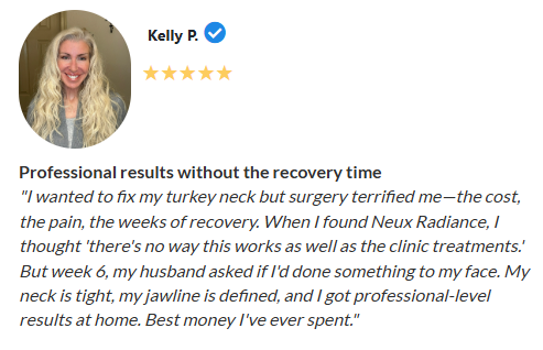 The Neux Radiance uses the TripleAction Lift System™ to deliver Morpheus8 results at home. Tightens loose neck skin, sharpens your jawline, and erases jowls, without needles, downtime, or thousand-dollar treatments. Just 5 minutes a day for a visible lift in 2 weeks.